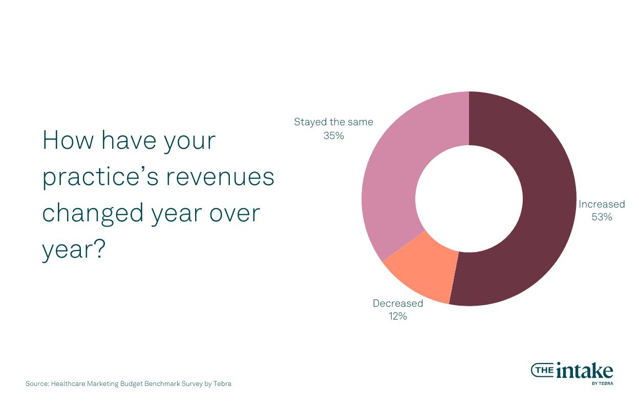 The majority of practices we surveyed reported that their revenues have increased year-over-year (53%), while 35% stated they stayed the same. Only 12% experienced a decrease in their revenue on a yearly basis.