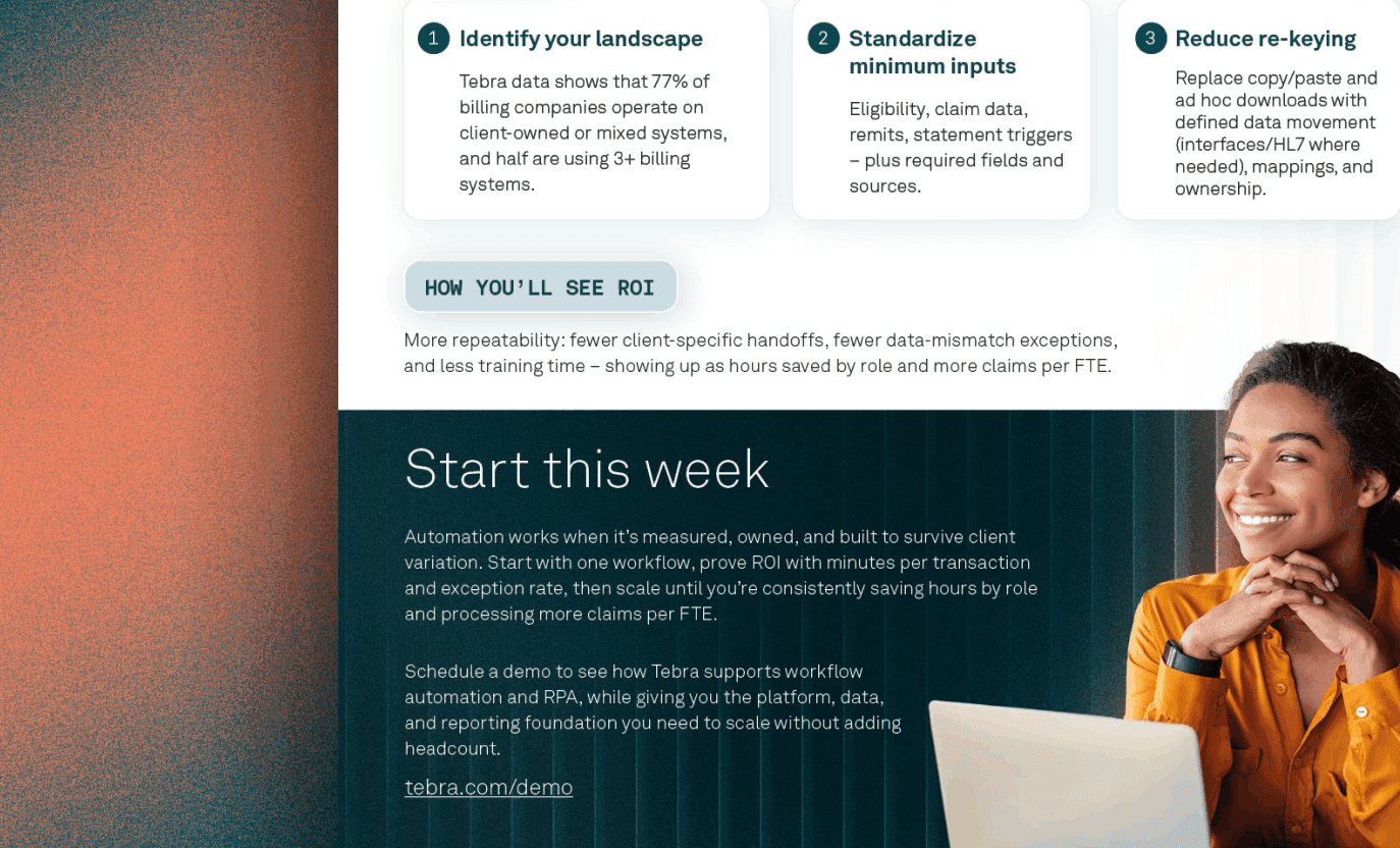 This mini-guide outlines a 30–60–90 day plan to pilot one workflow, prove ROI, and scale automation without creating backlog. Track minutes per transaction and exception rates, then convert saved hours into more claims per FTE, without adding headcount.