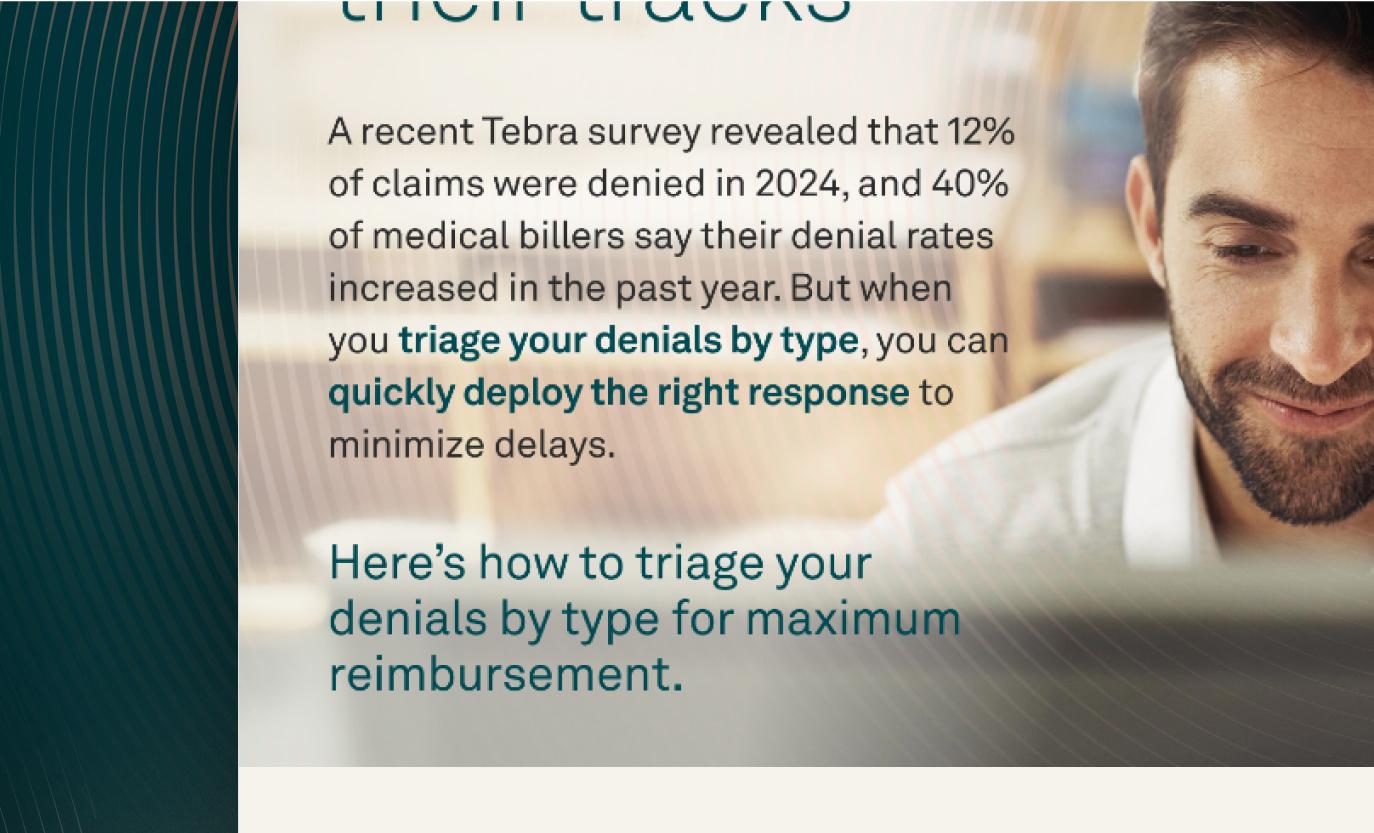 Denials don’t have to disrupt your revenue cycle. A recent Tebra survey found that the most common reasons for claim denials include coordination of benefits issues (45%), noncoverage (39%), and prior authorization errors (31%) — all of which can be prevented.
