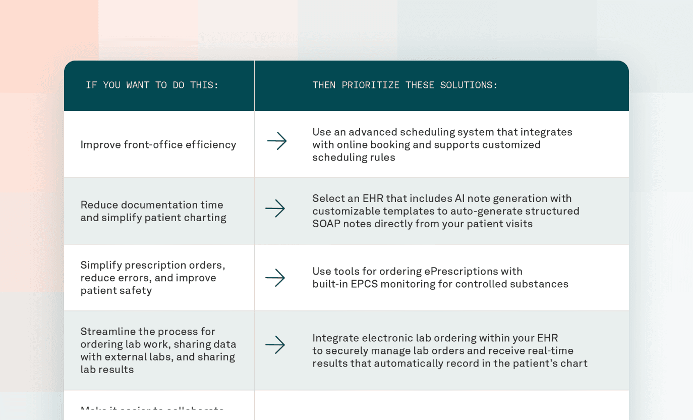 Get a FREE info sheetThe right EHR is a strategic decision that shapes how your team works and how your practice grows. This info sheet helps you cut through the clutter and choose software that fits your workflow, supports your staff, and keeps your focus on patient care.