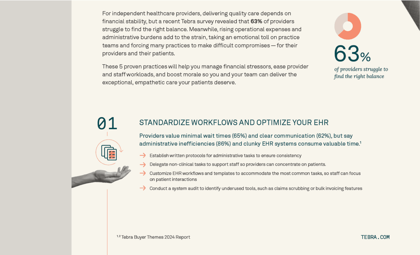 Thousands of practices have transformed their operations and elevated patient care with Tebra. Now it’s your turn. This FREE guide is packed with actionable strategies to reduce stress, boost revenue, and free up time for what matters most — your patients. Don’t wait to take control of your practice’s future. <br/>Download your free resource today.