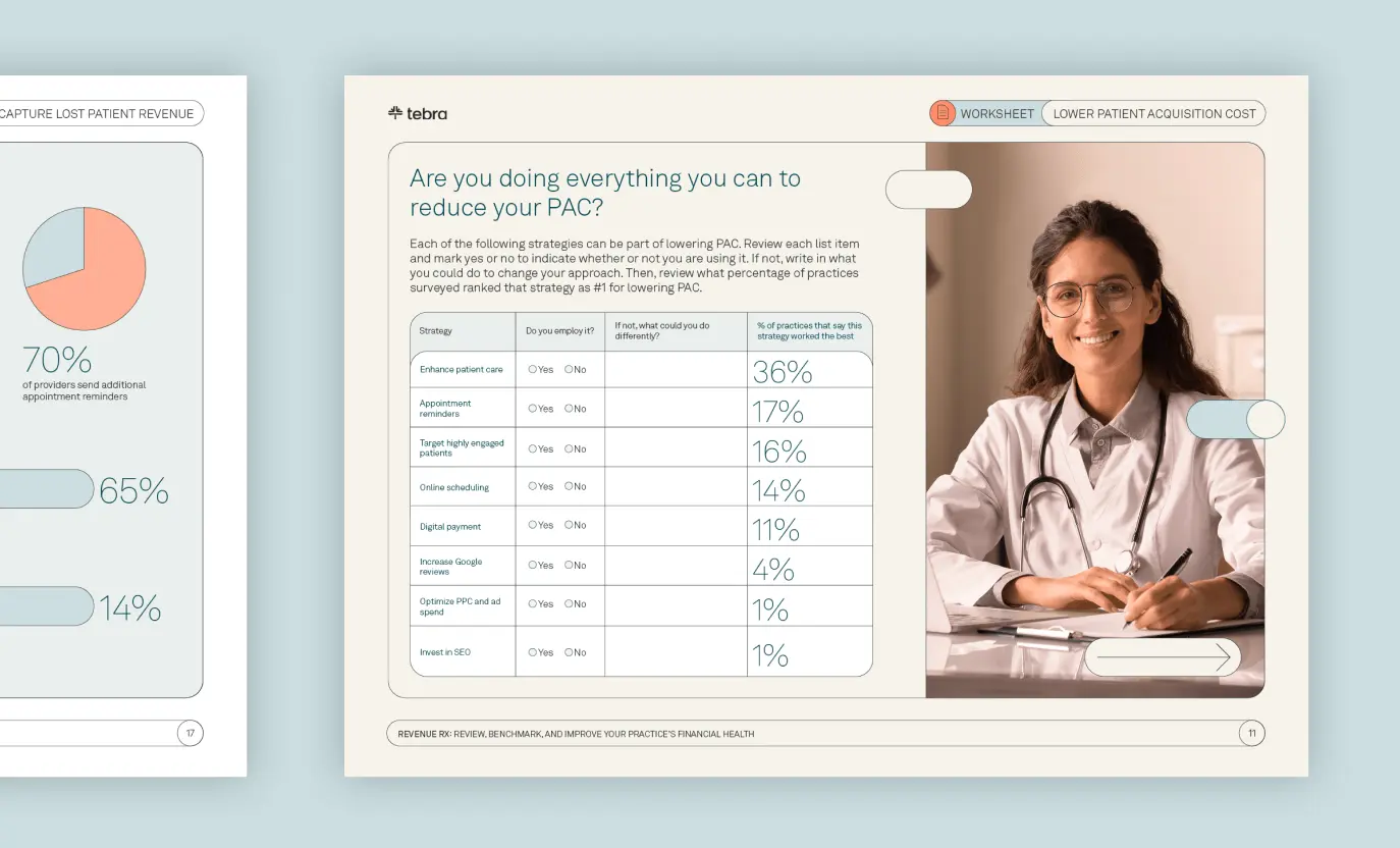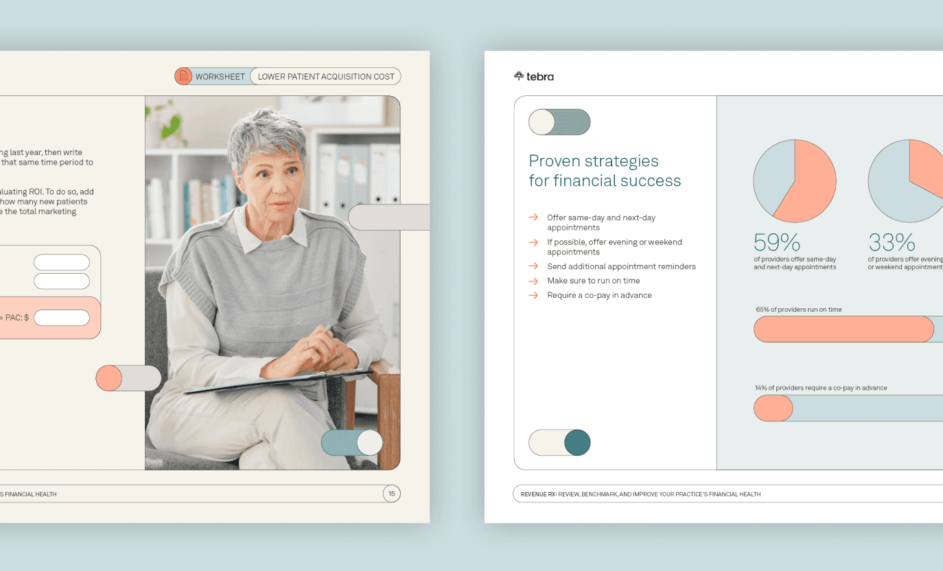Staying on top of your practice’s financial health is critical to your ability to provide patients with quality care. Tebra surveyed over 100 private practices for insights on where they are succeeding – or not – to help you evaluate your own performance against industry benchmarks. Discover how to diversify your revenue, lower operating costs, optimize billing procedures, and outshine your competitors to secure your financial future.