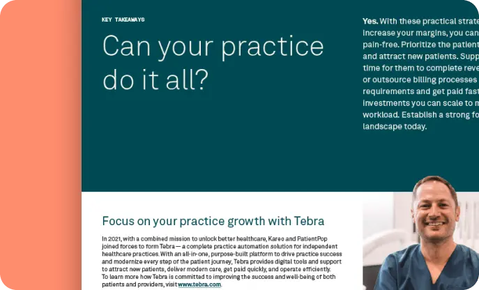 According to a recent survey, independent healthcare practices possess a strong belief in their potential for growth, yet lack confidence in their ability to scale amidst operational and financial pressures. Unlock the secrets to building a profitable and sustainable healthcare practice with our eBook, "How to Optimize Operations and Increase Margins as You Grow". Uncover actionable strategies that will help you: