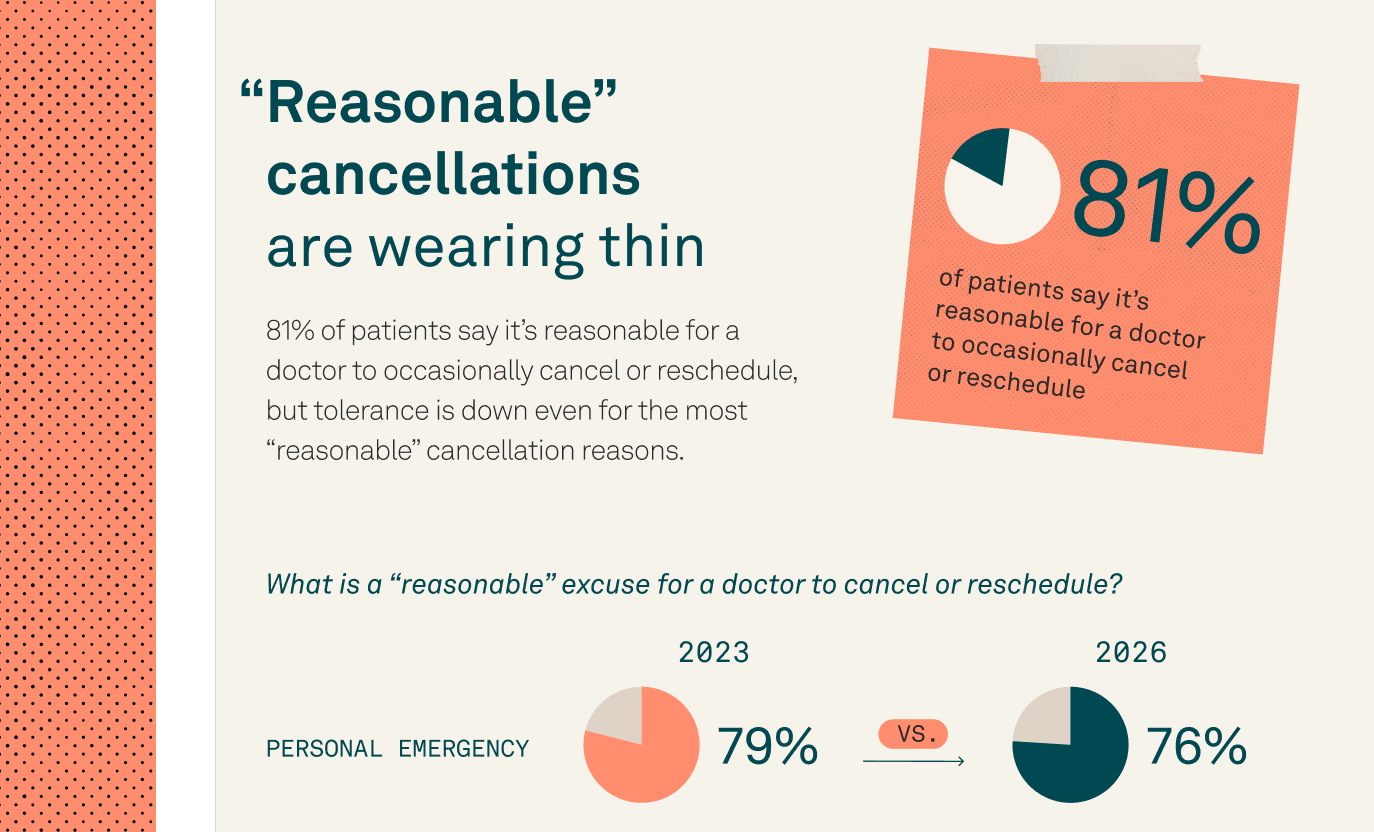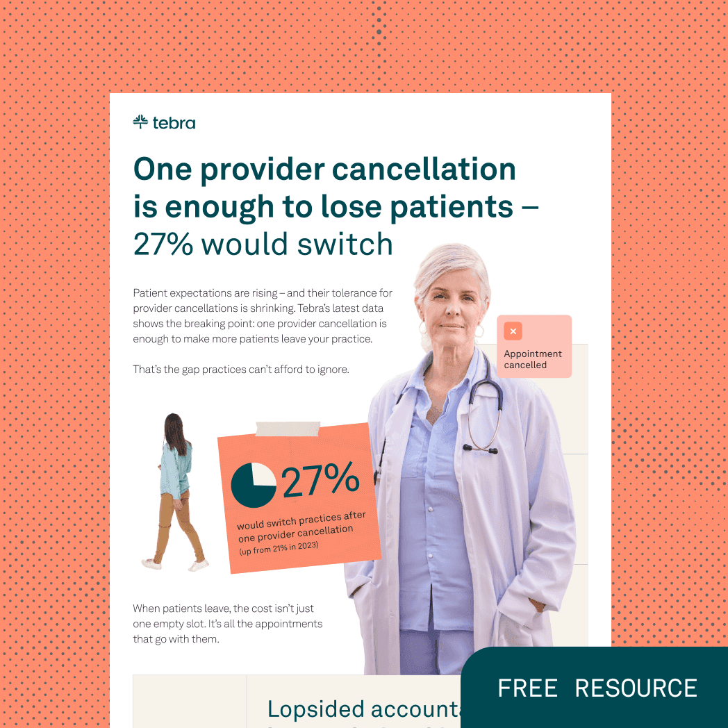 Patient expectations are rising, and tolerance for cancellations is shrinking. Tebra’s latest data shows that 27% of patients would switch practices after just one provider cancellation, up from 21% in 2023.