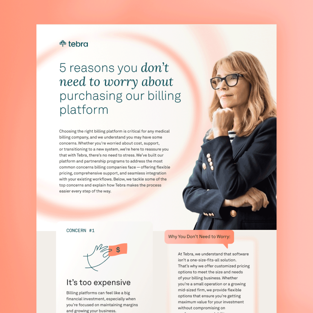 Flexible pricing, comprehensive support, and seamless integration with your existing workflows – those are all things you want to make sure you get in a new billing platform. We hear you. Discover how we tackle your concerns and explain how Tebra makes the process easier every step of the way.