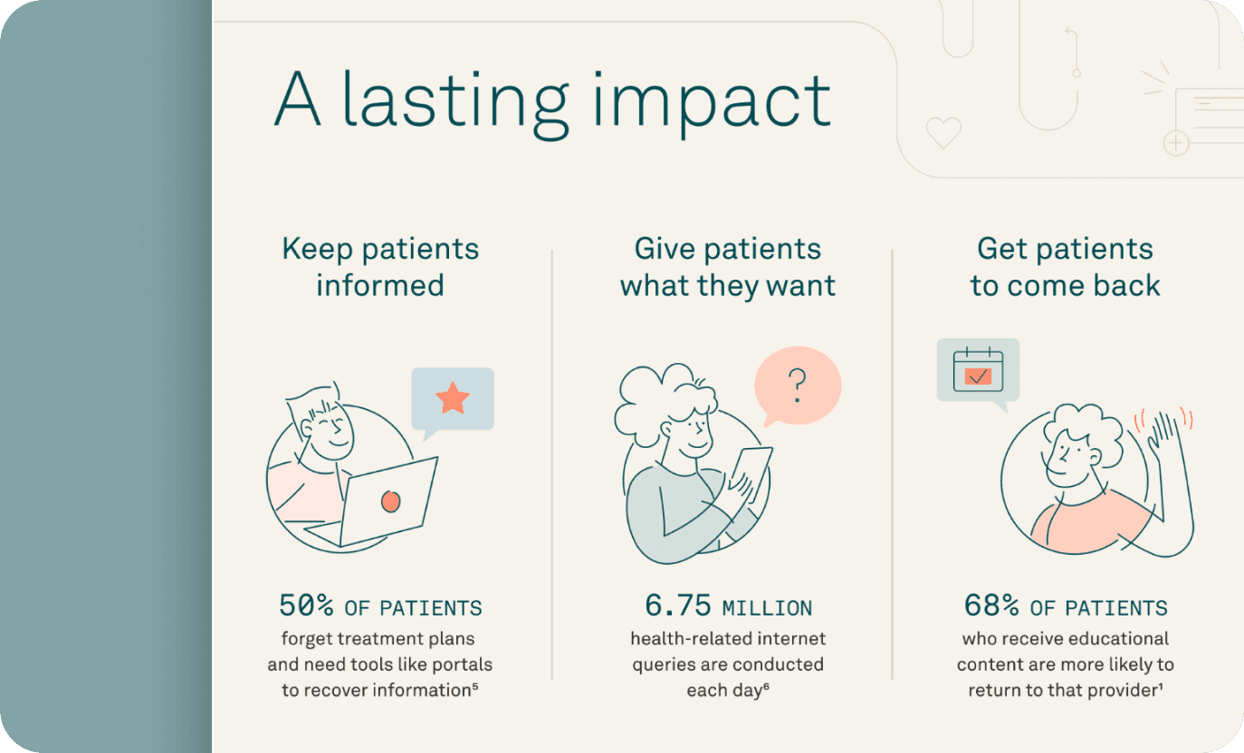 94% of patients crave educational content, yet nearly a one-third are left in the dark. Patient education not only empowers patients with valuable knowledge, but also builds unwavering loyalty. In fact, 68% of patients keep coming back to providers who offer comprehensive education. It’s time to revolutionize how you engage with your patients. Learn how to: