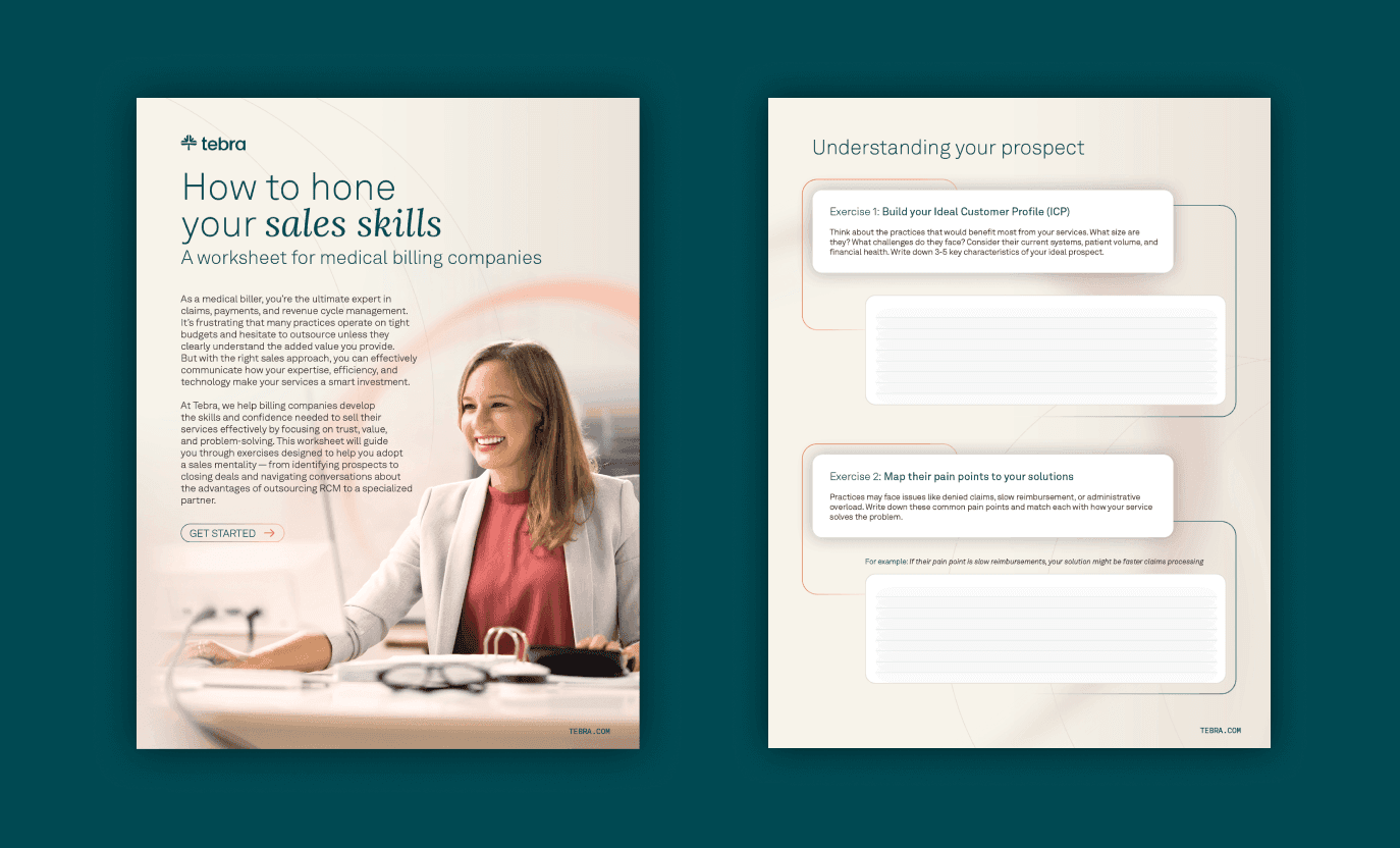 Selling your medical billing services doesn’t have to be intimidating. With the right sales approach, you can effectively communicate why your services are a smart investment for practices. Use this worksheet to help you adopt a sales mentality, improve your pitch skills, and navigate customer objections — so you can start closing more deals today.