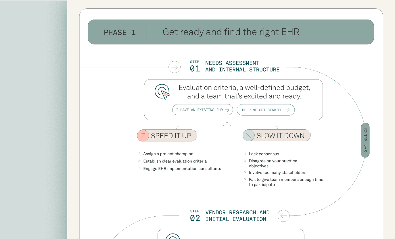Set aside ample time (typically 2-4+ weeks) to review your current tools and workflows, as well as document feedback from your team. Define a list of non-negotiable features and set a clear budget to follow. Assign an EHR selection team to review vendors and designate an internal implementation team to plan for the transition.