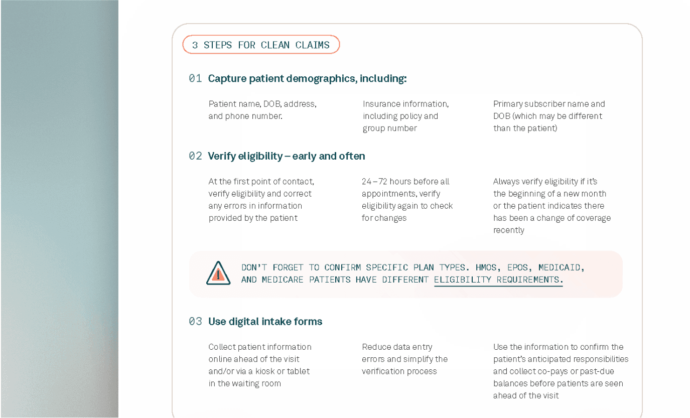 Digitizing the patient intake process can help providers improve the accuracy of key demographic and eligibility information to reduce errors and increase their clean claim rates. Providers should also be sure to include specific and proper coding documentation to support the services provided in each claim and increase approval rates.